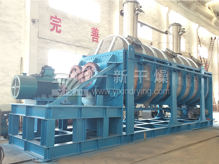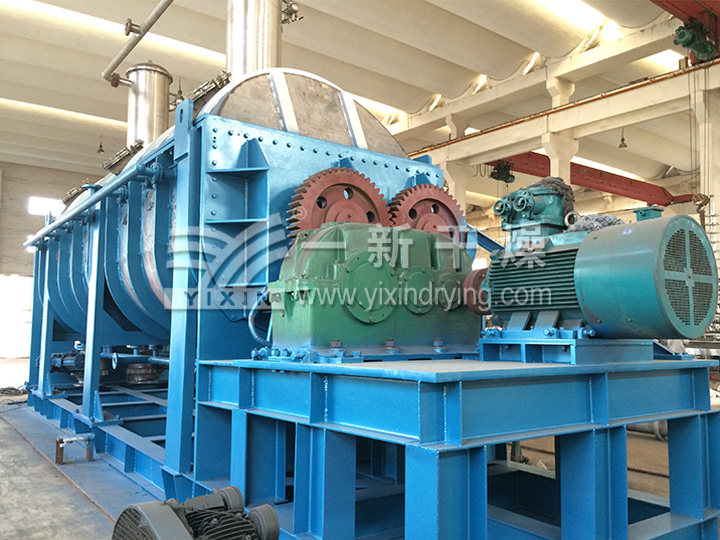 空心轴上密集排列着楔型中空桨叶,热介质蒸汽经空心轴流经桨叶,单位有效容积内传热面积很大。传热介质通过旋转接头,流经壳体夹套及空心搅拌轴,空心搅拌轴依据热介质的类型而具有不同的内部结构,以保证^佳的传热效果。在桨叶及夹套通入热介质加热的同时,出料口上部同时进行抽湿,这样大大增加了设备的干燥强度。蒸发出来的水份由抽湿风机带出干燥机。
