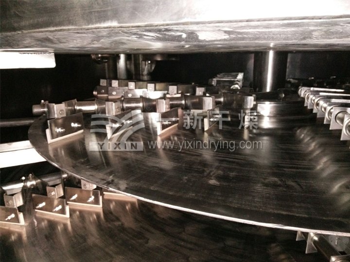 湿物料自加料器连续地加到干燥器上部一层干燥盘上,带有耙叶的耙臂作回转运动,使耙臂连续地翻抄物料。物料沿指数螺旋线流过干燥盘表面,在小干燥盘上的物料被移送到外缘,在大干盘上的物料向里移动并从中间落料口落入下一层小干燥盘中。大小干燥盘上下交替排列,物料得以连续地流过整个干燥器。中空的干燥盘内通入加热介质,加热介质形式有饱和蒸汽、热水和导热油,加热介质由干燥盘的一端进入,从另一端导出。已干物料从^后一层干燥盘落到壳体的底层,^后被耙叶移送到出料口排出。湿汽从物料逸出,由设在顶盖上的排湿口排出,真空型盘式干燥器的湿汽由设在顶盖上的真空泵口抽出。从底层排出的干物料可直接包装。通过配加翅片加热器、溶剂回收冷凝器、袋式除尘器、干料返混机构、引风机等辅机,可提高其干燥的生产能力,干燥膏糊状和热敏性物料,可方便地回收溶剂,并能进行热解和反应操作。