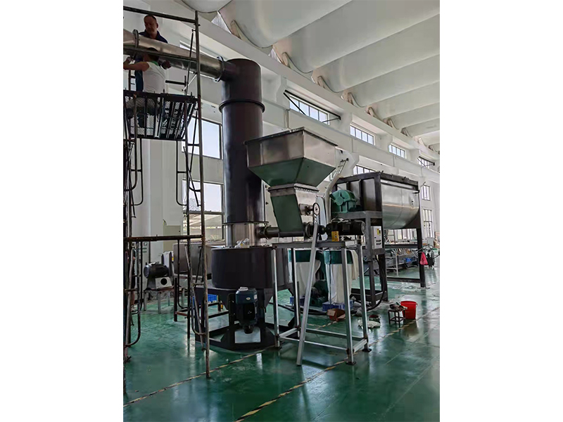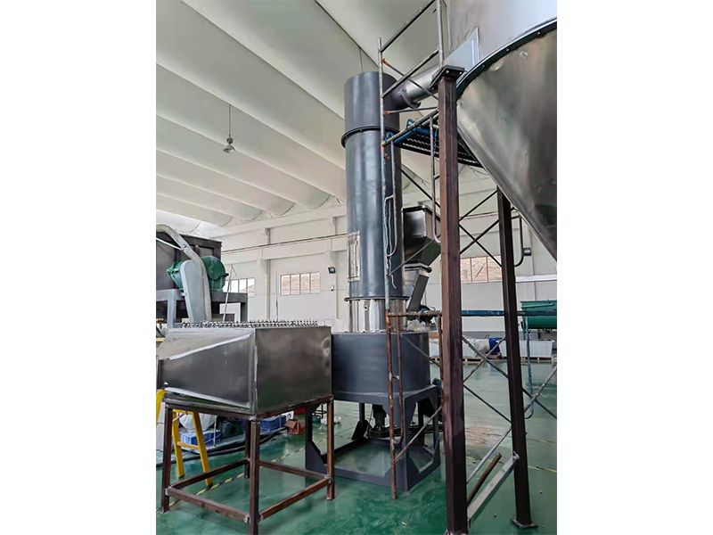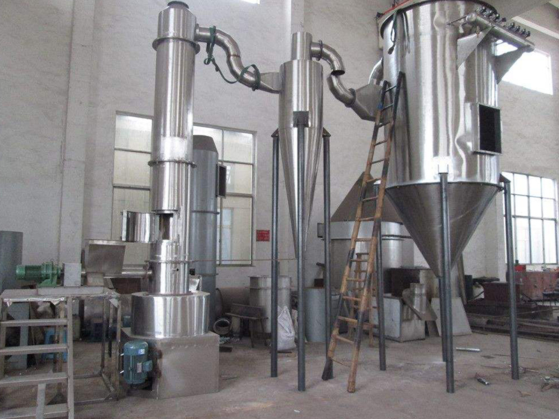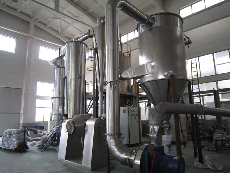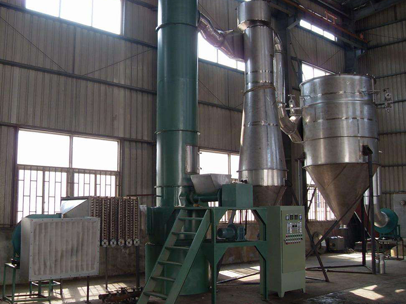经换热器加热后的洁净空气被鼓入进风口,以适宜的速度旋入干燥室底部的环隙,然后按切线方向进入干燥室,并呈螺旋状上升;同时,物料则由可无级调速的加料器定量加入塔内。在干燥塔内,物料与热空气进行充分质热变换,被干燥的粉状物料随同热风一起输送至分离器,其中成品收集包装,而尾气则进一步经除尘装置处理后排空。