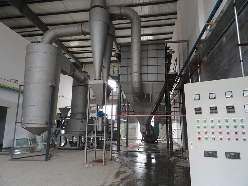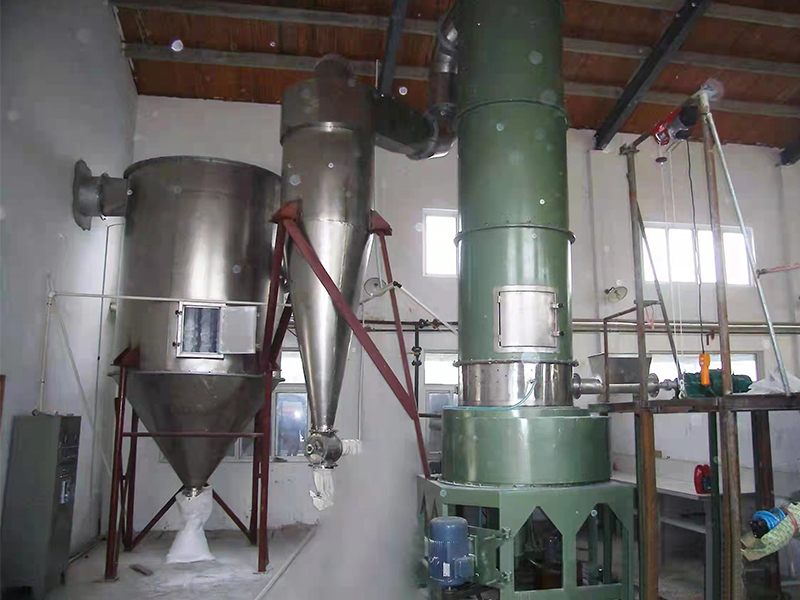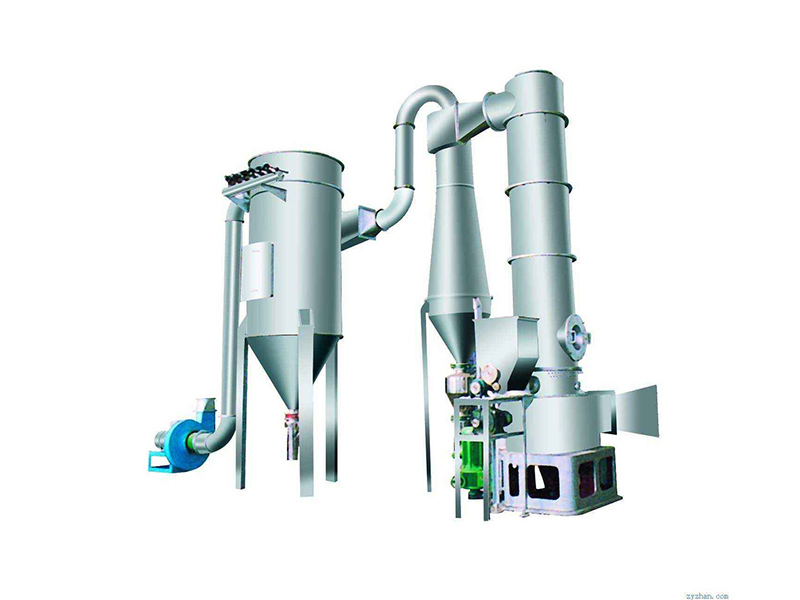 在干燥室上部,设有环状的挡板,即分级器。物料随旋转气流夹带上升,由于受离心力作用,大块的,未达到水份要求的(即比重较大)物料受离心力作用,其旋转半径增大,当其旋转半径大于分级器的半径时,被挡在干燥室内进一步干燥粉碎,直至满足要求方才溢出。较细的粉碎体在干燥室中部干燥后随气流夹带上升,由于其粒径较小且达到水份要求(即比重较小),离心力相对较小,其旋转半径小于分级器半径,然后就随气流排出,送至收集装置。
