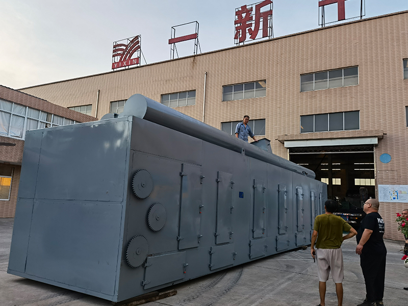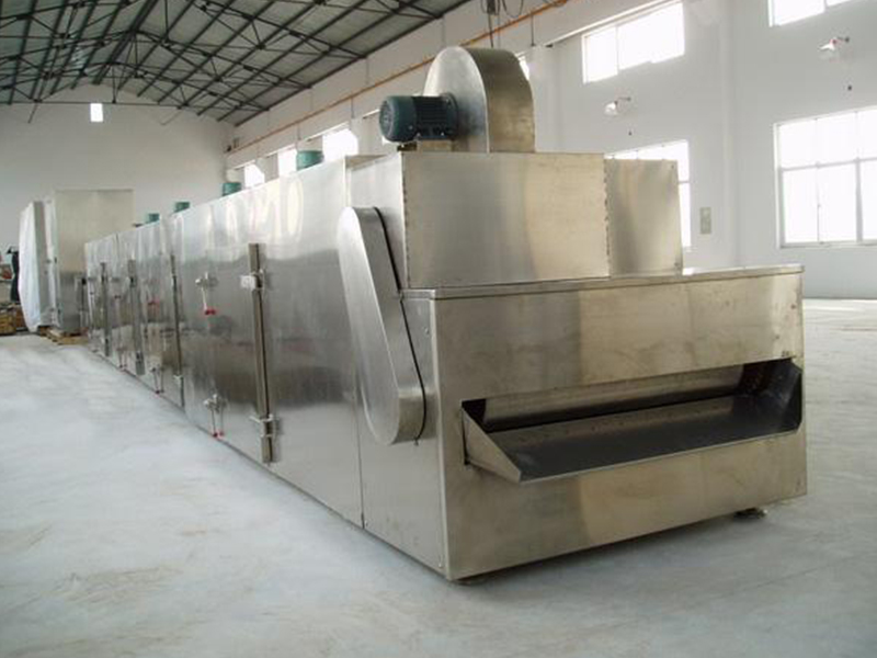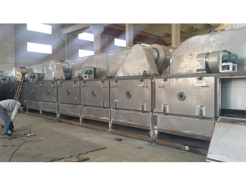 物料由加料器均匀地铺在网带上,网带一般采用12-60目不锈钢丝网,由传动装置拖动在干燥机内移动。干燥机由若干单元组成,每一单元热风独立循环,部分尾气由专门排湿风机排出,废气由调节阀控制,热气由下往上或由上往下穿过铺满物料的网带完成热量与质量传递的进程,带走物料水份。网带缓慢移动,运行速度可根据物料温度自由调节,干燥后的成品连续落入收料器中。上下循环单元根据用户需要可灵活配备,单元数量亦可根据需要选取。