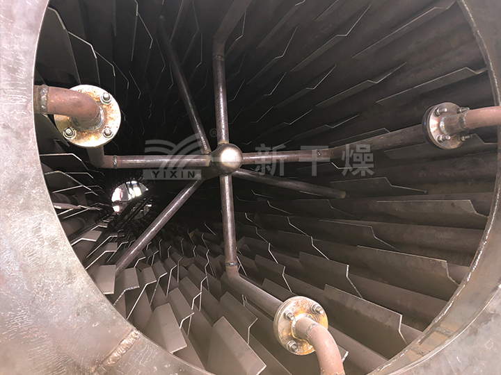 一)工作原理: 在密闭的干燥室内,一根带有数十片的圆盘的转子缓慢旋转,热介质从空心轴的一端进入,通过旋转金属圆盘将热量传递给物料,物料在金属圆盘外吸热增焓不断蒸发湿份,冷却的热介质从转子的另一端排出。转子周边通过固定角钢架装有带一定倾角的刮板,随着..