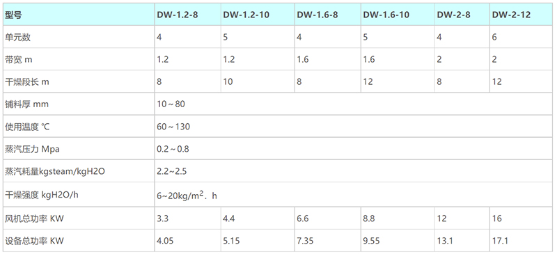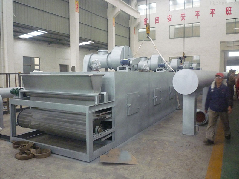 带式干燥机由若干个独立的单元段组成。每个单元段包括循环风机、加热装置、单独或公用的新鲜空气抽入系统和尾气排出系统。对干燥介质数量、温度、湿混度和尾气循环量操作参数。可进行独立控制,人而保证带式干燥机工作的可靠性和操作条併的优化。带干机操作灵活・湿物进料。干燥过程在完全密封的箱体内进行。劳动条件较好。免了粉尘的外泄。带式干燥机是成批生产用的连集式干爆设备。该系列干燥机具有干燥速度快蒸发强度高、产品质量好的优点。对脱水滤饼类的膏状物料,需经造粒或制成条状后进入网帯连续干燥。网带可以有单层式、多层式,増加行程使单位面积扩大,按污泥处理量量身制作。