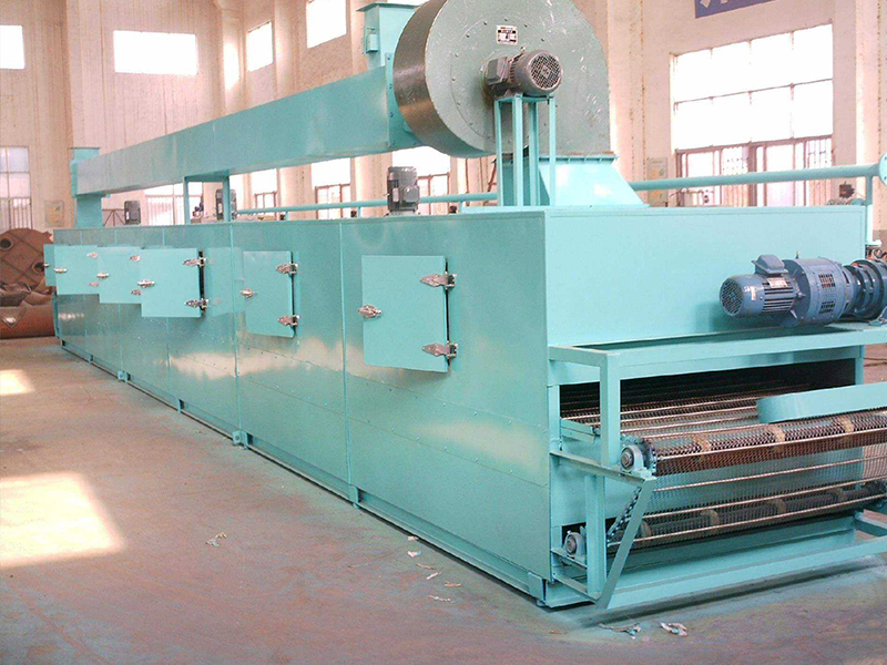 物料由加料器均匀地铺在网带上,网带一般采用12-60目不锈钢丝网,由传动装置拖动在干燥机内移动。干燥机由若干单元组成,每一单元热风独立循环,部分尾气由专门排湿风机排出,废气由调节阀控制,热气由下往上或由上往下穿过铺满物料的网带完成热量与质量传递的进程,带走物料水份。网带缓慢移动,运行速度可根据物料温度自由调节,干燥后的成品连续落入收料器中。上下循环单元根据用户需要可灵活配备,单元数量亦可根据需要选取。