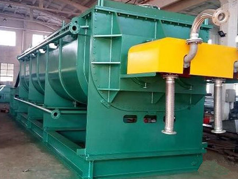 空心轴上密集排列着楔型中空桨叶,热介质经空心轴流经桨叶。单位有效容积内传热面积很大,热介质温度从-40℃到320℃,可以是水蒸汽,也可以是液体型:如热水、导热油等。间接传导加热,没有携带空气带走热量,热量均用来加热物料。热量损失仅为通过器体保温层向环境的散热。楔型 桨叶传热面具有自清洁功能。物料颗粒与楔型面的相对运动产生洗刷作用,能够洗刷掉楔型面上附着物料,使运转中一直保持着清洁的传热面。桨叶干燥机的壳体为W型,壳体内一般安排二到四根空心搅拌轴。壳体有密封端盖与上盖,防止物料粉尘外泄及收集物料溶剂蒸汽。出料口处设置一挡扳,保证料位高度,使传热面被物料覆盖而充分发挥作用。热介质通过旋转接头,流经壳体夹套及空心搅拌轴,空心搅拌轴依据热介质的类型而具有不同的内部结构,以保证传热效果。